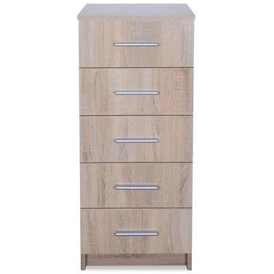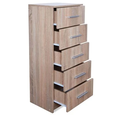 Ce meuble est fait d’aggloméré. Il dispose de 5 tiroirs et il constitue une solution de rangement idéale pour les vêtements et les petits objets. Deux ancrages muraux pour empêcher le basculement du buffet sont inclus dans la livraison. Ce meuble de rangement durable est facile à nettoyer. L’assemblage est facile.